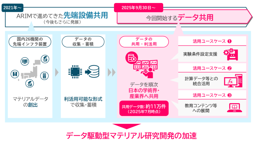 文部科学省では「マテリアル先端リサーチインフラ(ARIM)」事業において、国内26の大学・研究機関に先端設備の全国的な共用体制を整備するとともに、共用設備の利用により創出されたマテリアルデータを、データサイエンス等に利活用しやすい形式に整えて収集・蓄積してきた。この度、約11万件のデータを令和7年9月30日から所定の利用料のもとで共用開始する(共用データ数は今後も設備利用に応じて増加予定)。多様な設備群から創出されたマテリアルデータが、個々の研究機関の垣根を越えて広く利活用されることにより、データ駆動型マテリアル研究開発の加速とともに、我が国の国際競争力の引き上げが期待される。